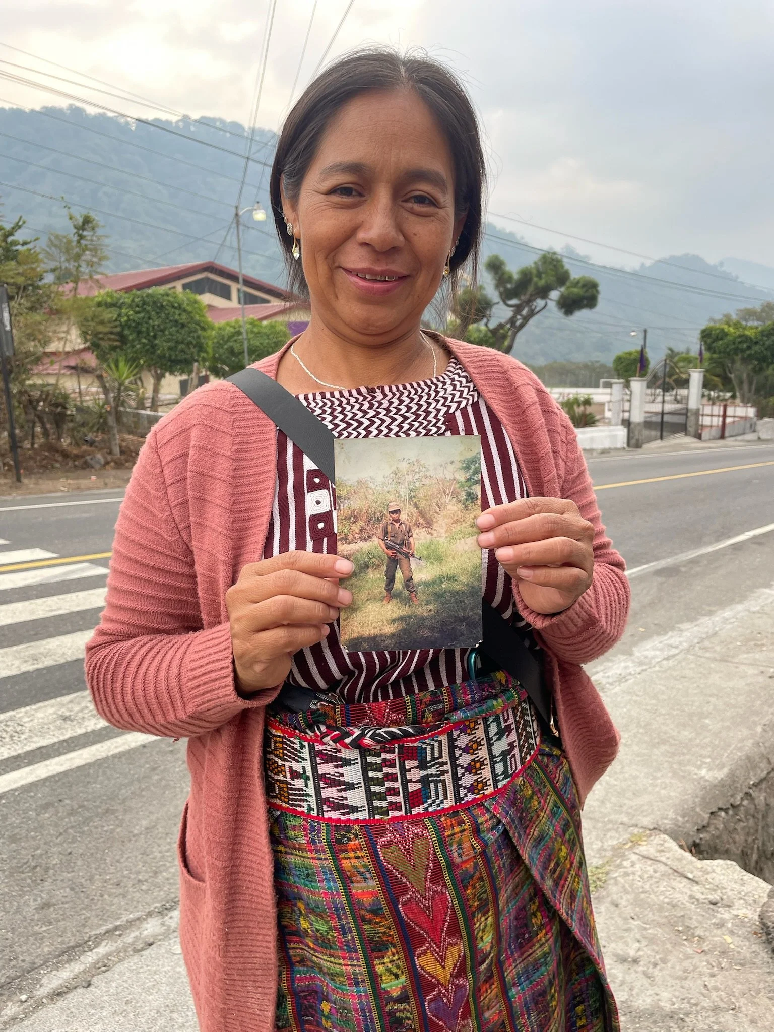 Doña Flavia holding a photo of her younger self from her time as a guerrilla fighter.