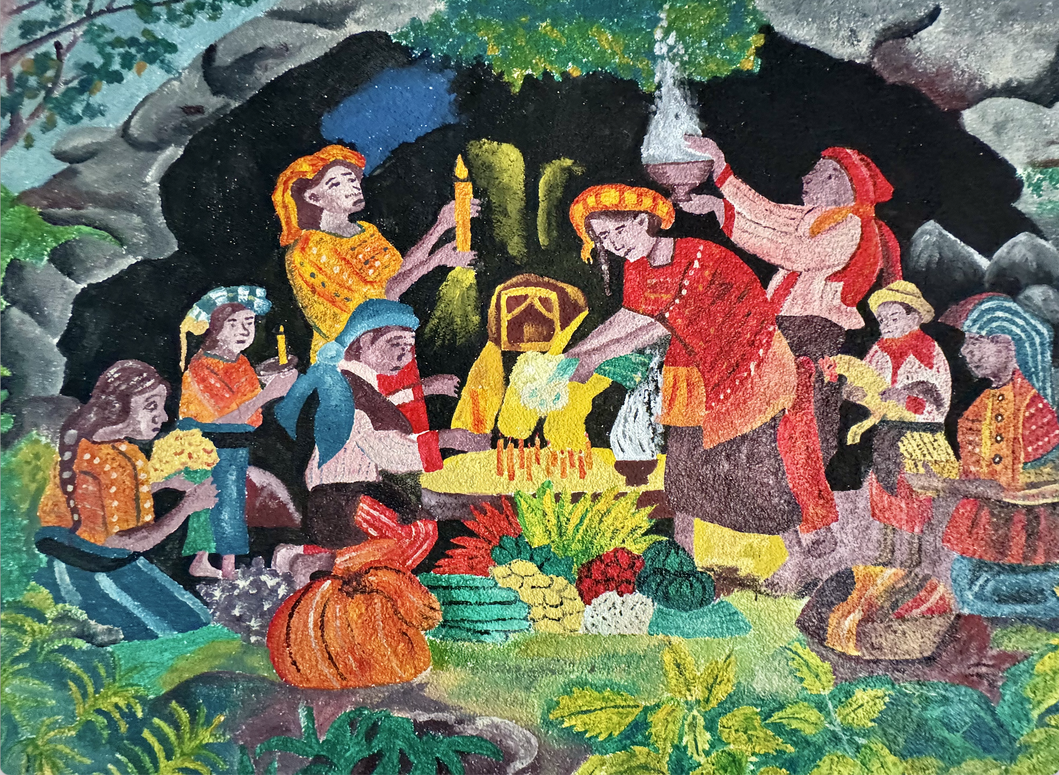 A mural depicting a Maya ritual displayed at a small university in the southern Sololá region. Photo by Aidan Sheedy